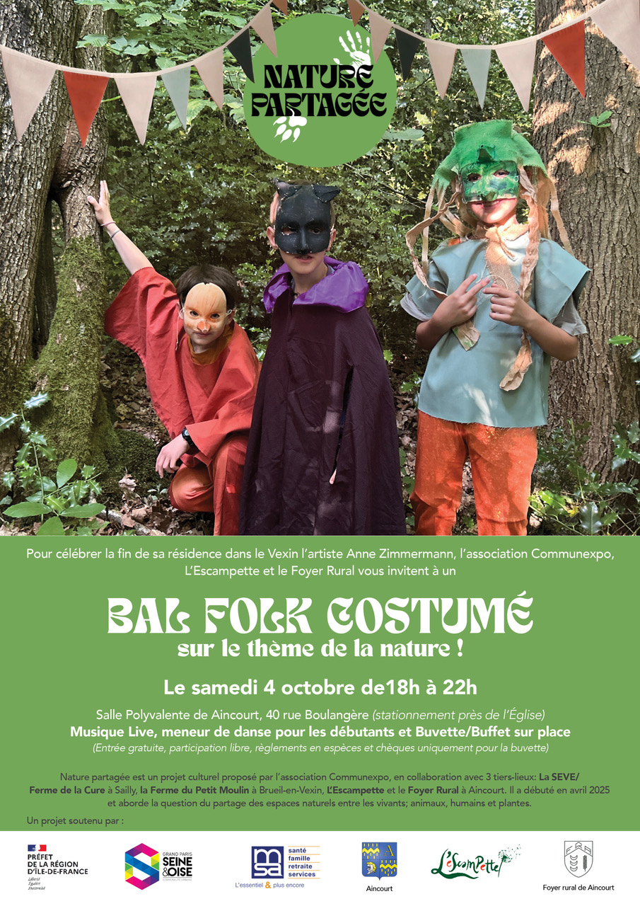 Pour célébrer la fin de sa résidence dans le Vexin, l’artiste Anne Zimmermann, l’association Communexpo, l’Escampette et le Foyer rural de Aincourt vous invitent à un bal folk costumé sur le thème de la Nature !